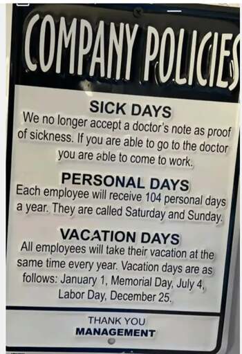 RustyChainsawEnema@lemmy.dbzer0.com to A Boring Dystopia@lemmy.world · 10 months agoSounds like a place I'd love to worklemmy.worldimagemessage-square0linkfedilinkarrow-up11arrow-down10file-textcross-posted to: workreform@lemmy.worldlemmyshitpost@lemmy.world