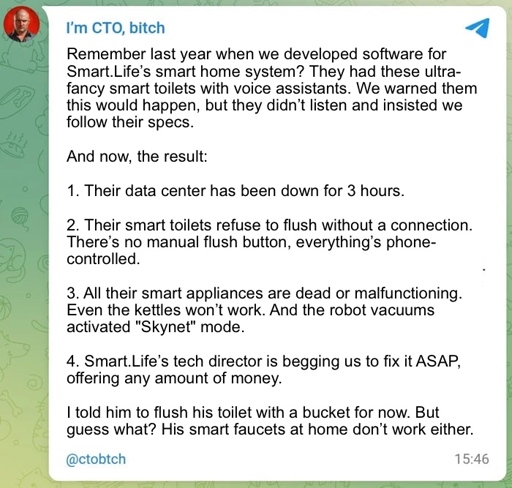 ☆ Yσɠƚԋσʂ ☆@lemmy.ml to Programmer Humor@lemmy.mlEnglish · 9 months agoNo Connection, No Flushlemmy.mlimagemessage-square13linkfedilinkarrow-up197arrow-down13cross-posted to: programmer_humor@programming.dev