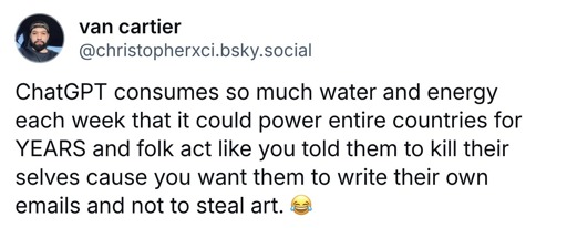 You’re not gonna save the world by not using ChatGPT, just like you won’t save all those slaves in Zambia by not buying from Apple, and just like you didn’t destroy Twitter by joining Bluesky.