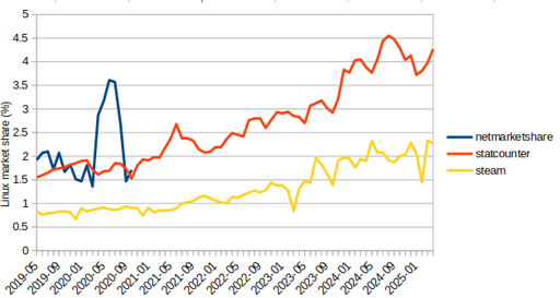 It seems to have plateaued and increasing more slowly. Combining data from Steam and Statcounter reveals this: