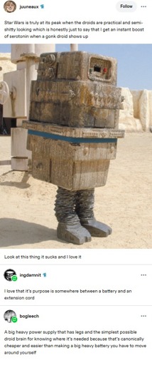 There’s also rumours of a “Cult of the Power Droids”. Where a group of gonk robots would show up at night and ask for donations. And the best way to get rid of them, is to say “Gonk. Gonk. Gonk ko kyenga see”, which is apparently so rude it can’t legally be translated to basic(galactic basic standard, aka “english”).