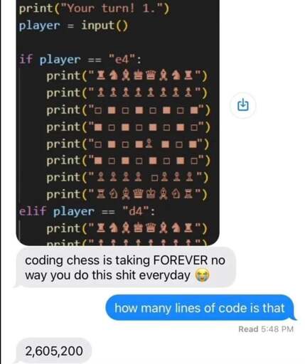 This reminds me of one of my very first programs, a tic-tac-toe game I wrote in high school. It displayed hardcoded grids of Xs and Os and blanks very similar to what’s shown here. This approach worked because of the much more limited move possibilities. The program could always win if it made the first move, and always win or tie if the human moved first, depending on if the human made mistakes. I wish I still had the code.