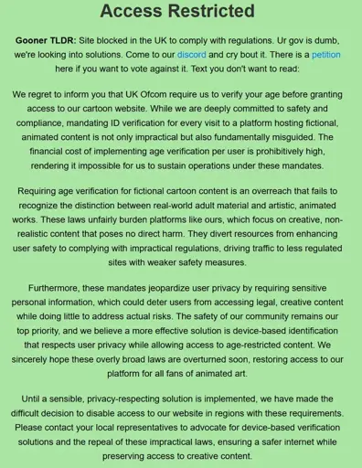 themachinestops@lemmy.dbzer0.com to Technology@lemmy.worldEnglish · 5 months agoRule34 blocked the UK entirely rather than comply due to the new law.lemmy.dbzer0.comimagemessage-square178linkfedilinkarrow-up11.17Karrow-down111