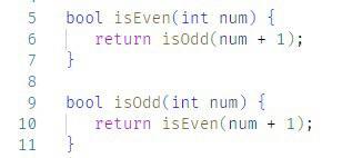 boolean isOdd(int num) { if(num == 1) return true; if(num > 0) return isEven(num - 1); else return isEven(num + 1); } boolean isEven(int num) { if(num > 0) return isOdd(num - 1); else return isOdd(num + 1); }the downside with this approach is that it will eventually terminate. the version in the original post has the advantage of giving me plenty of time to contemplate life’s many mysteries.