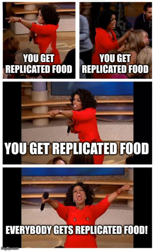 That could make sense, if a ship is on missions 3 weeks away from a resupply it’d make sense if there’s a replicator limit for individuals. Like they have allotments for full meals each day and maybe books or personal items, but they still need to keep par values if matter in reserves. If you respond to a distress call, it’d be difficult to explain that you can’t replicate repair parts for the disabled vessel because Mark replicated instruments for an orchestra he wants to put together and Karen redecorated her quarters for the 13th time this month.