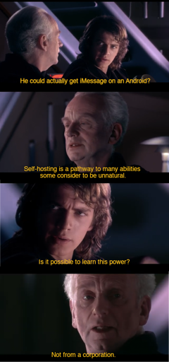 mulcahey@lemmy.world to Self-hosting@slrpnk.net · 5 months agoThe story of Darth BlueBubbles the Wiseslrpnk.netimagemessage-square29linkfedilinkarrow-up1260arrow-down15