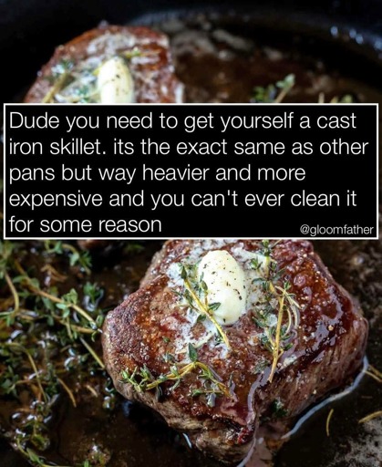 I saw some greentext about some list of caring for castioron/developing and maintaining seasoning. The list was some collection of a bunch of progressively more absurd tips. The comments were: