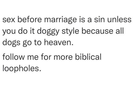 So I, a devout worshipper of my partners jingle-jangles, am automatically going to heaven because I’ve been making him my bitch in my throes of passion every weekend?