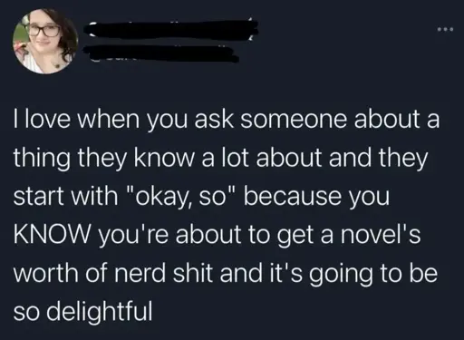 - my “okay, so…” beginning are usually trying to break my specialty into human-understandable language and prep an analogy. aint nobody but my nerdboi peers care about the dinglehooper flooting the yoonerbix .001ms faster than the yumdumtrum. - “its like a bicycle with 7 wheels, but only three wheels work at once.” is easier to explain. - Yea but that .001 ms results in 16 more gigglebiggles per cycle and thats significant. Who wouldn’t be amazed!