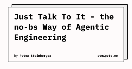 arrow-up1-47arrow-down1external-linkJust Talk To It - the no-bs Way of Agentic Engineeringsteipete.mecodeinabox@programming.dev to Programming@programming.devEnglish · 13 days agomessage-square8linkfedilink