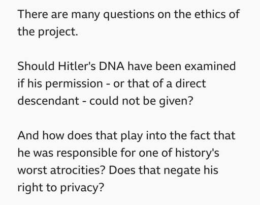 If it turns out Hitler had some bad genes his relatives’ descendants will get a bad name. This is obviously a joke, but it’s actually true as well. They’ve all distanced themselves from the name Hitler, but surely some people know about their relation to Adolf. I guess the questions is: how bad is it when you’re grandfathers half-brother or whatever his DNA is public. There is a legitimate privacy concern there, that shouldn’t be too easily dismissed because ‘haha hitler & privacy’.