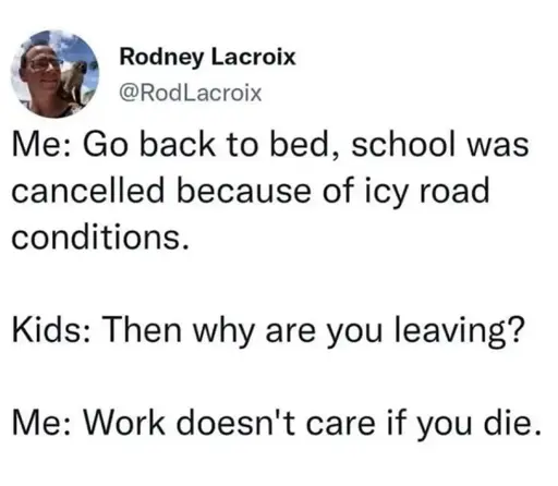 One, online school is now a viable option so this conversation is basically moot. Two, those policies tend to be written in, if not blood, expensive litigation and terrible optics. Minnesota used to have a very aggressive avoidance policy to school closures. Then 300 kids didn’t get home after school until 9pm-12am. . Now school gets delayed or closed much more regularly.