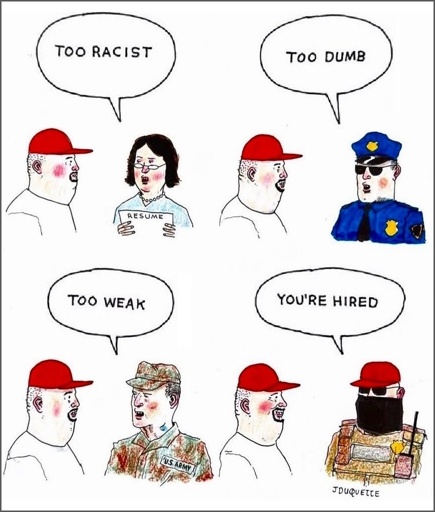 I hate these because these groups (cops,military) are also “racist, dumb and weak” and also a not insignificant amount of ICE personal are former military.