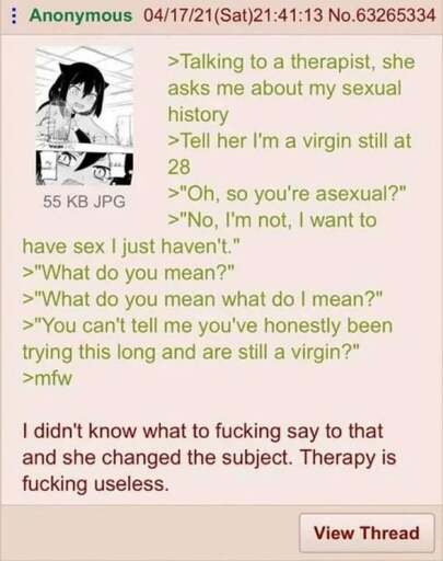 If this is true, OOP probably had some long unresolved trauma and/or underlying guilt religious indoctrination or obesity, low self-esteem or depression or something similar holding him back for that long. Not sure if this greentext was a word-for-word quoted conversation between a real-life patient & therapist, but if so, that therapist’s credentials need to be revoked. More likely the conversation was an imaginary one from some OOP’s lazy self-deprecating imagination.