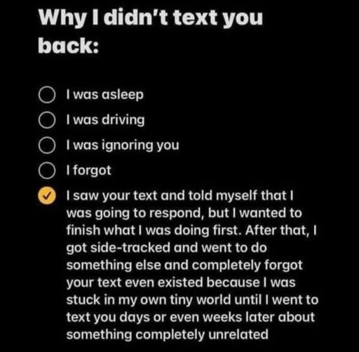 I remembered just a little to late where the anxiety of responding late caused me to delay responding even further and now im stuck in a time based guilt loop, and now its for sure way to late to respond to the text and now im more guilty.