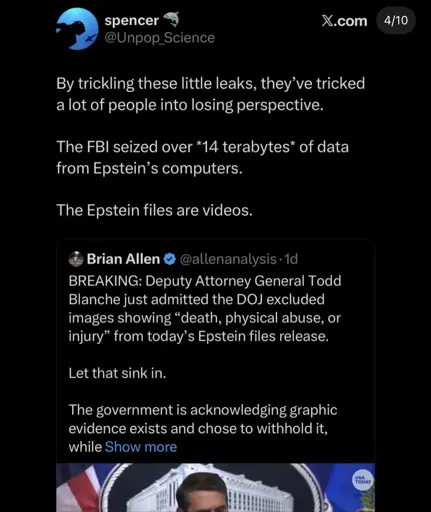 spaghettiwestern@sh.itjust.works to Political Memes@lemmy.world · 14 days agoThe DOJ excluded images showing "death, physical abuse or injury" from Epstein files release.sh.itjust.worksimagemessage-square81linkfedilinkarrow-up1968arrow-down14