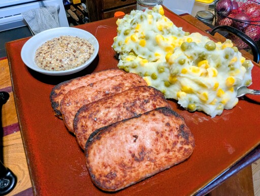 This is where pantry clean out met up with my upcoming Sunday edition Heathcliff edit. I can cook spam with just one arm.