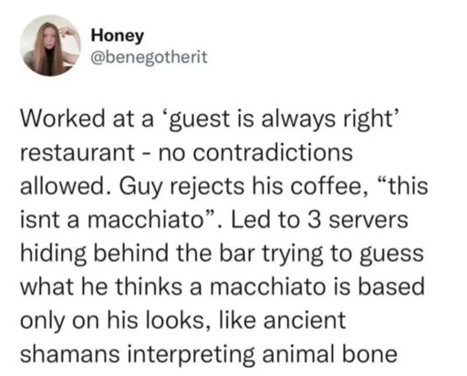 I stand by if you got handed the order you placed, and you think it’s wrong. Drink the fucking drink. Barring a health issue or an allergy it’s not going to hurt you. If you continually get a bad/wrong/weird drink at that coffee shop. Find another coffee shop. Or make coffee at home. The customer is not always right.