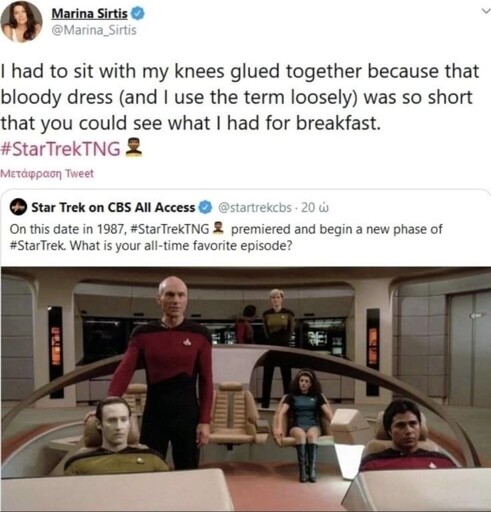 I believe that second one is actually from the episode where O’Brian accidentally gets all the normal sized shirts stuck in the transporter buffer so everyone breaks out their night shirts until Data suggests reversing the polarity and running them through the deflector array, after which they just had to send some folk from the lower decks outside to grab and iron them.