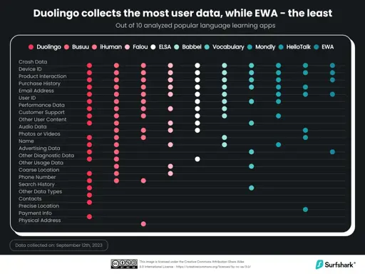 I should have known if the apps free, you’re the product. Duolingo appears to harvest the most data compared to other language learning apps.